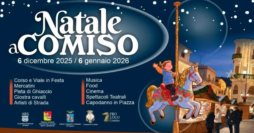 Dal 6 dicembre 2025 al 6 gennaio 2026, il centro di Comiso si trasforma in un vero villaggio natalizio. Le vie del centro si accendono con luci, mercatini artigianali, pista di ghiaccio, giostra dei cavalli e tante altre sorprese.